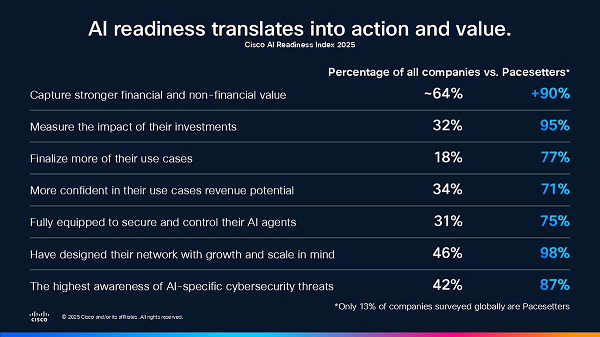 A Cisco (NASDAQ: CSCO), líder mundial em redes e segurança, divulgou os resultados da terceira edição do Índice Anual de Preparação para IA (Cisco AI Readiness Index). Um pequeno mas consistente grupo de empresas pesquisadas — os Pacesetters ou “Empresas Referência” — supera seus pares em todas as métricas de valor de IA, observadas pela primeira vez no estudo global da Cisco, que ouviu mais de 8.000 líderes em IA em 30 países e 26 setores. Esse seleto grupo representa cerca de 13% das organizações entrevistadas nos últimos três anos. No Brasil, o índice é superior à média global, com 18% das empresas sendo consideradas “referência”, apesar de uma queda em relação aos 25% reveladas na edição de 2024.